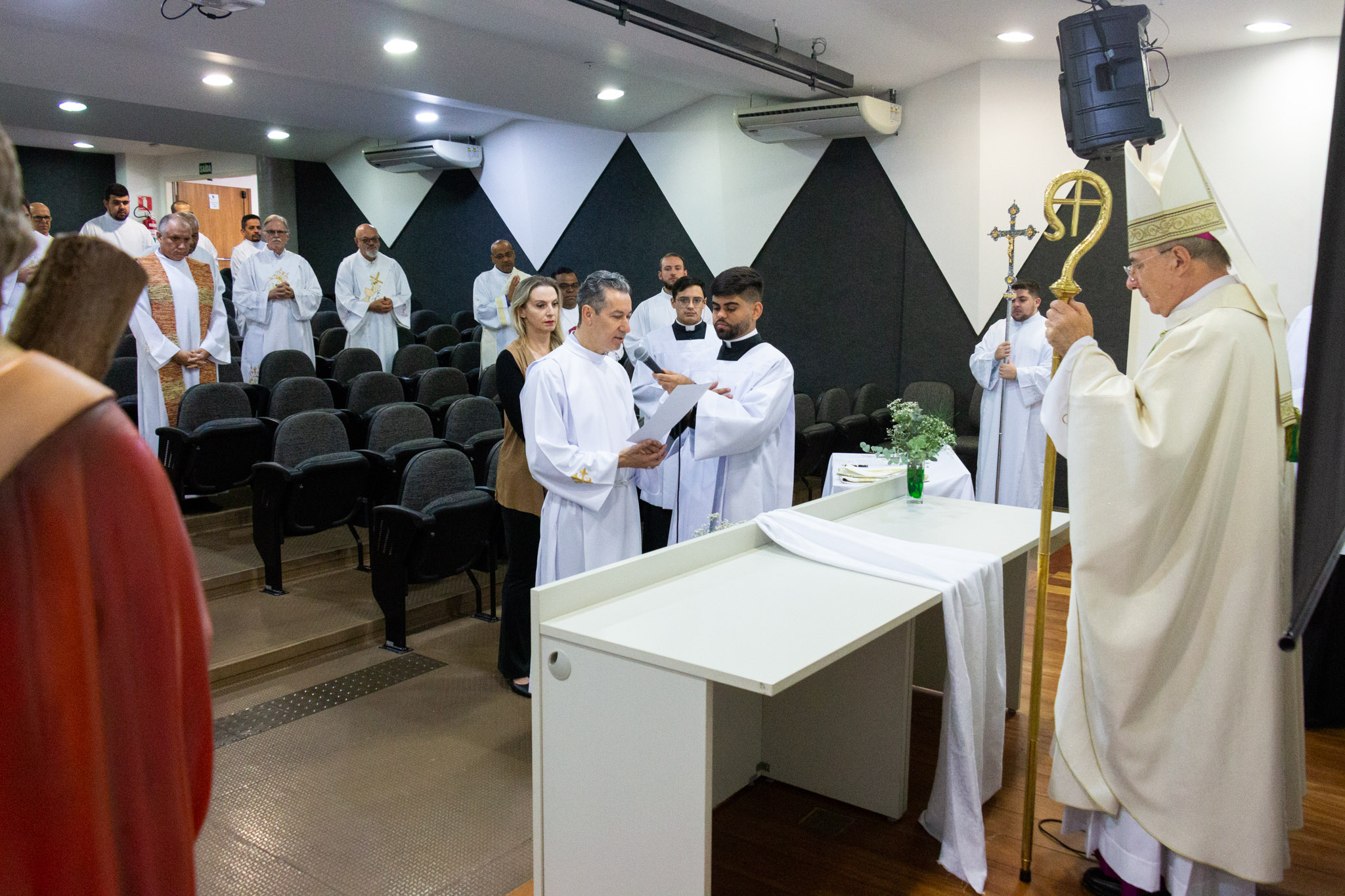 O rito de ordenação teve início no auditório do Edifício Sede da Cúria Diocesana Santo André Apóstolo, onde Sidney fez o juramento de fidelidade e a profissão de fé na presença do bispo, sua esposa, padres, diáconos e seminaristas. Este compromisso público expressa a fidelidade e a comunhão com a missão da Igreja, que Sidney assumirá em seu ministério diaconal.