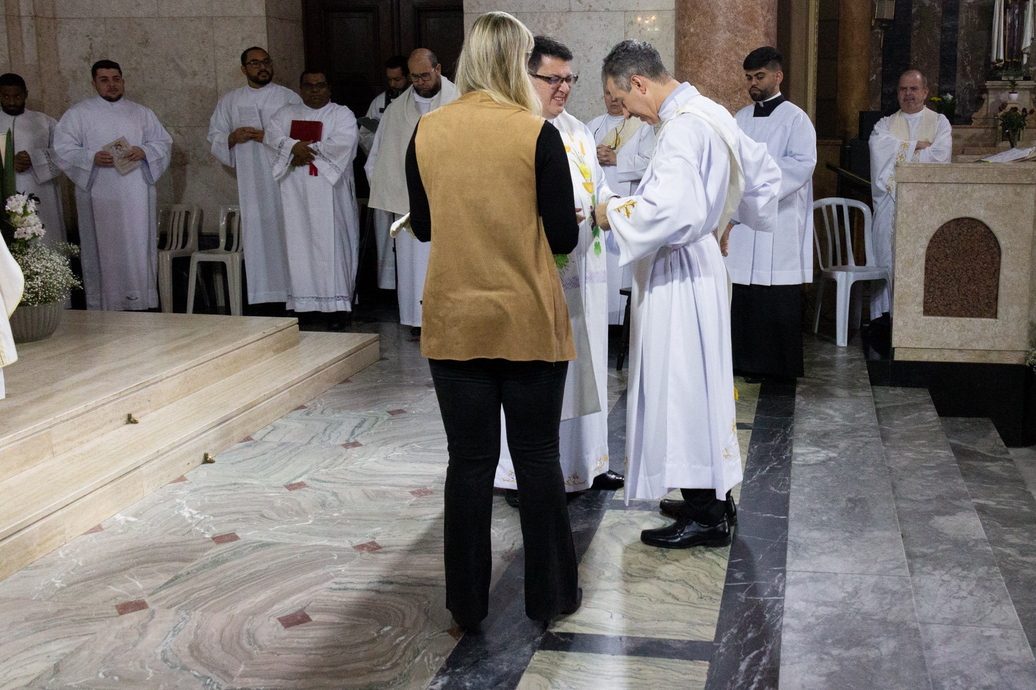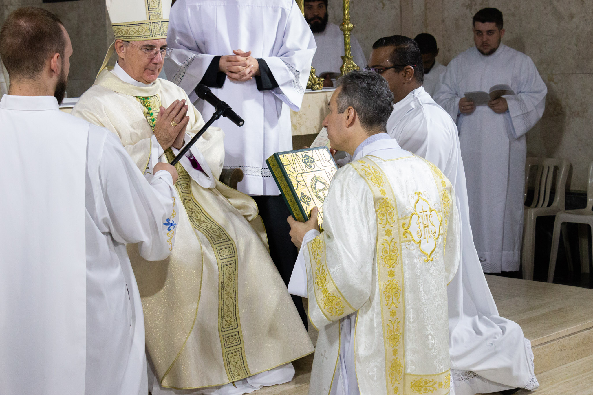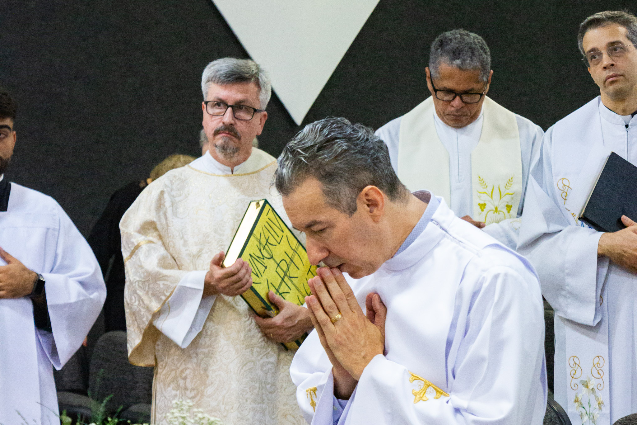 A cerimônia prosseguiu com a Ladainha de Todos os Santos, durante a qual a assembleia pediu a intercessão dos Santos e Santas de Deus. A imposição das mãos e a prece de ordenação foram momentos de profundo silêncio e oração, simbolizando a escolha divina e a graça do Espírito Santo sobre o novo diácono. Após a oração, Sidney foi revestido com a estola e a dalmática, símbolos do amor-serviço de Cristo, e recebeu o Livro dos Evangelhos, sendo constituído mensageiro da Palavra.