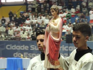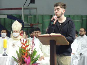 Dom Pedro iniciou saudando a todos, ecoou dentro do ginásio um “bom dia” dos mais de 1900 coroinhas e cerimoniários presentes no ginásio, e nosso bispo responde com um sorriso emocionado, e lembrou a alegria e entusiasmo de louvar a Deus, bendizendo o servir e fortalecimento de todos ali presentes.