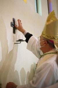 Após a homilia, iniciou-se o rito de dedicação. Ainda com as luzes apagadas, o ministério de música junto com toda a igreja entoou a Ladainha de Todos os Santos, Dom Pedro ungiu o altar e paredes onde estavam as doze cruzes, que representam os doze apóstolos de Jesus, fez incensação e pediu para que Padre Everton e Padre Paulo fizessem a incensação também das paredes da igreja.