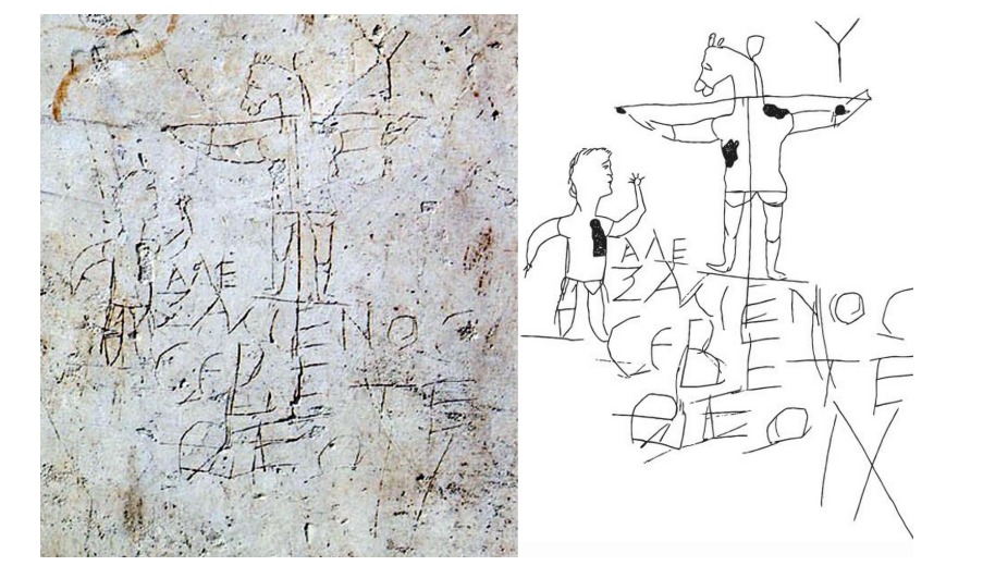 A cruz era, portanto, representada como signum salutis mais do que instrumento de patíbulo. O tema do crucifixo permaneceu quase desconhecido à iconografia até que Teodósio, o Grande, suprimiu a pena humilhante da cruz e a imagem não suscitou mais uma associação negativa. A representação do Messias crucificado “escândalo para os judeus e loucura para os pagãos” (1 Cor 1,23) podia, de fato, escandalizar os hebreus e atemorizar os neófitos, além de suscitar o desprezo dos pagãos, como aparece na famosa imagem burlesca do III século, que se encontra na Casa degli Araldi (Antiquário do Palatino), com a representação de um crucificado com cabeça de asno e um devoto com a inscrição “Alexamenos adora o seu Deus”. A primeira representação da cruz em sentido cristão remonta ao II século (ano 134 d.C.) e corresponde a uma cruz que faz parte de uma inscrição descoberta em Palmira. Imagem do Cristo crucificado, ao invés, será ainda posterior. Não se pode desconsiderar o contexto de perseguições às comunidades cristãs como fator que também contribuiu para a não explicitação da cruz na arte cristã nascente.