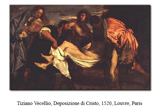Talvez a sombra dessa sutil veladura no rosto em função dos cabelos que lhe caem diante seja intuída a partir do que fizera anteriormente Tiziano Vecellio (+ 1576), que empregou esse recurso em sua obra Deposição de Cristo, conservada em Paris, no Museu do Louvre. A sombra sobre a cabeça fez com que ela aparentasse estar retraída em relação ao corpo, sobre o qual incide forte luz. Igualmente quis aludir à sombra da morte em função da qual não era mais possível contemplar o rosto adorável do Salvador do mundo e que não aparecia mais com as características próprias do “mais belo dos filhos dos homens” (Sl 45,3).