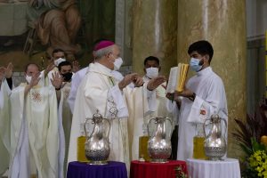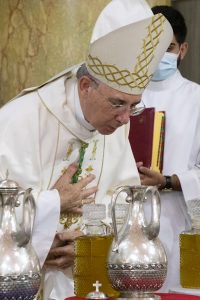 Seguindo o rito dessa celebração, Dom Pedro cercado dos sacerdotes, abençoa os Óleos dos Catecúmenos, utilizados no Sacramento do Batismo; dos Enfermos, utilizados no Sacramento da Unção dos Enfermos; consagra também os Óleos do Crisma, utilizados nos sacramentos da Crisma, do Batismo e da Ordem, bem como na consagração de altares e igrejas. Esses Óleos recebem durante a consagração a mistura do bálsamo, o que lhe confere um cheiro agradável, pois o cristão deve irradiar “o bom perfume de Cristo”, e o sopro do bispo, como sinal do Espírito Santo.