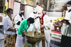 Após a benção da água batismal, Padre Joel apresentou a catecúmena Luciana Ferreira, que faz parte da turma da Iniciação à Vida Cristã para Adultos da Catedral, Dom Pedro seguiu com o rito do batismo, manifestando ao final a alegria e acolhendo a batizada com uma salva de palmas.
