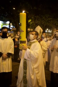 A celebração iniciou-se do lado de fora da Catedral, os fiéis aguardavam ansiosos para reviverem esse momento que após dois anos acompanhando de casa, devido a pandemia. Dom Pedro começou o rito com a bênção do fogo e depois com a procissão do Círio Pascal, que representa Cristo ressuscitado.