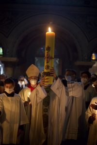Assim como aconteceu em todas as paróquias da Diocese de Santo André, na Igreja Mãe, a Catedral nossa Senhora do Carmo, no centro de Santo André, celebraram no neste sábado à noite (16/04) a Vigília Pascal, a noite mais importante para os católicos, que recordam e comemoram a vitória de Jesus Cristo sobre as trevas. A Missa foi presidida pelo bispo Dom Pedro Carlos Cipollini, e concelebrada pelo pároco e vigário geral, Pe. Joel Nery, e o pelo secretário episcopal, Pe. Camilo Gonçalves.