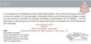 O Tenente-Coronel aproveitou a ocasião para fazer o convite da Solenidade Alusiva ao 66º Aniversário da Unidade, ocasião em que ocorrerá a cerimônia de Outorga da Medalha Cinquentenário do 10º BPM/M – “Cel PM Bertholazzi” e descerramento do Retrato na Galeria dos Eternos Comandantes do Cel PM Maurício da Silva Inchauspe.