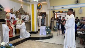 “Thiago foi escolhido, sendo ungido hoje, será enviado em missão por Jesus Cristo através da Igreja, sinalizada pelo bispo, sucessor dos apóstolos, que o está ordenando. Lembre-se que a missão deve ser exercida ao modo de Jesus, pois na sua humildade, Jesus é luz para nós, aquele que devemos seguir e você deve ir até os últimos, aos esquecidos e permanecer no amor de Deus, não em palavras, mas em vida, e essa é sua missão profética”, enfatiza Dom Pedro.